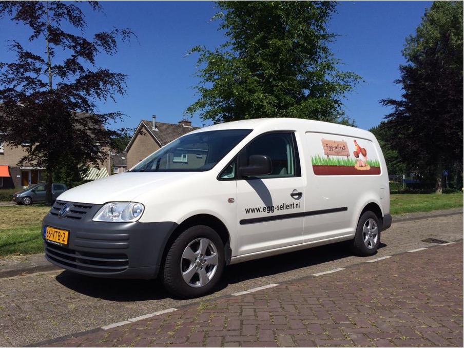 Ondertussen groeide het aantal verkochte eieren zo hard, dat we al snel meer verkochten dan mijn kennis, de eierboer. Sterker nog: de rollen draaiden compleet om, hij kwam ineens bij ons inkopen. Dat ging overigens niet onopgemerkt: door het gewicht van zijn bus reed hij de tegels van de gedeelde oprit kapot. Ook ons vervoer groeide mee met het bedrijf. De Renault Kangoo werd ingeruild voor een Volkswagen Caddy Maxi. Rond diezelfde tijd maakte mijn zus een logo en hadden we voor het eerst bestickering op de auto, een mijlpaal, want Egg-sellent begon steeds meer een echte, herkenbare naam te worden.