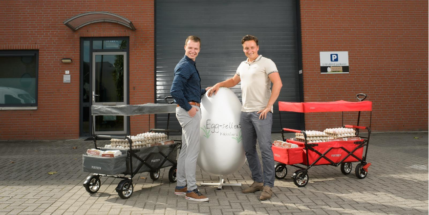 Of toch niet? Want mijn broertje, Jochem, die het al een tijdje leuk vond om mee te lopen, gaf aan dat hij wel graag een eigen eierwijkje zou willen gaan lopen. En dat bracht me op het idee wat vandaag, 22 jaar later is uitgegroeid tot het concept vandaag de dag: ik regel een bolderkar, maak een looproute in een nieuwe wijk, werf klantjes en stel mijn broertje voor aan de mensen die klant worden, ik loop nog een weekje mee, dan gaat mijn broertje zelfstandig aan de slag en laat hem per ei een leuk bedrag verdienen.